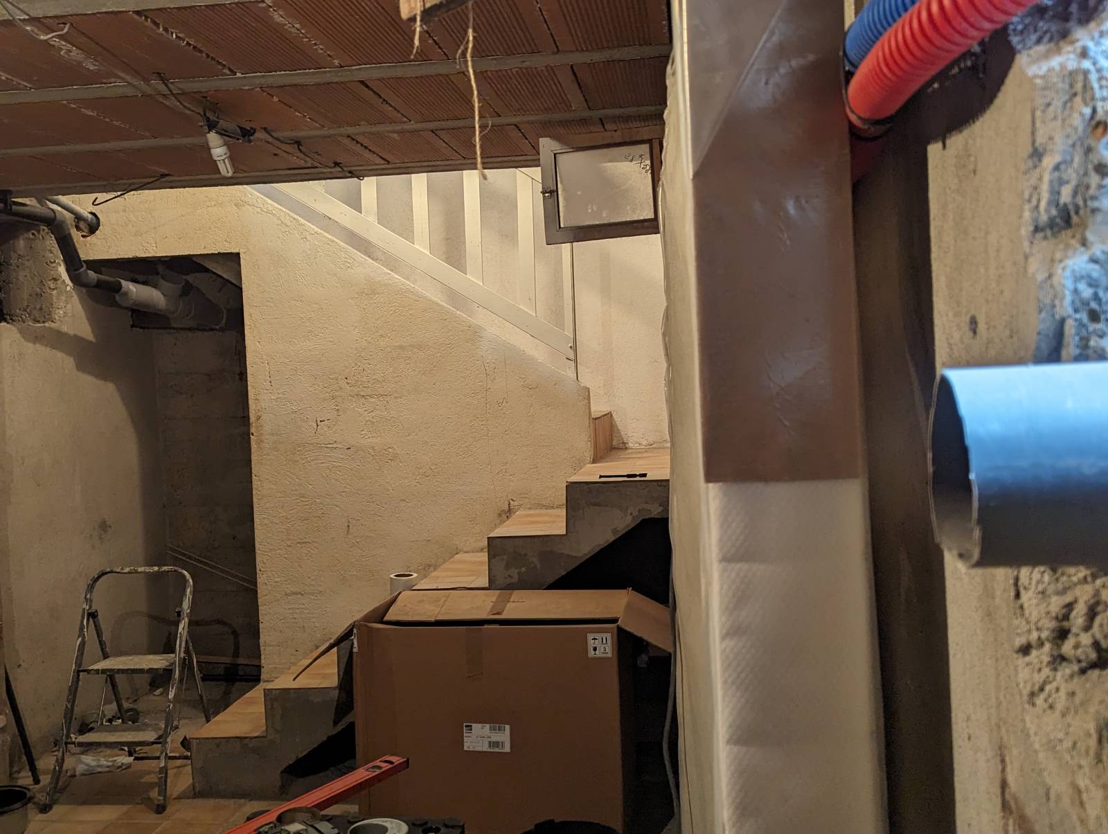 - L'évacuation des eaux usées arrivants au sous sol de la maison se retrouve à un mètre et cinquante centimètres plus basse que l'évacuation déjà existante la maison.