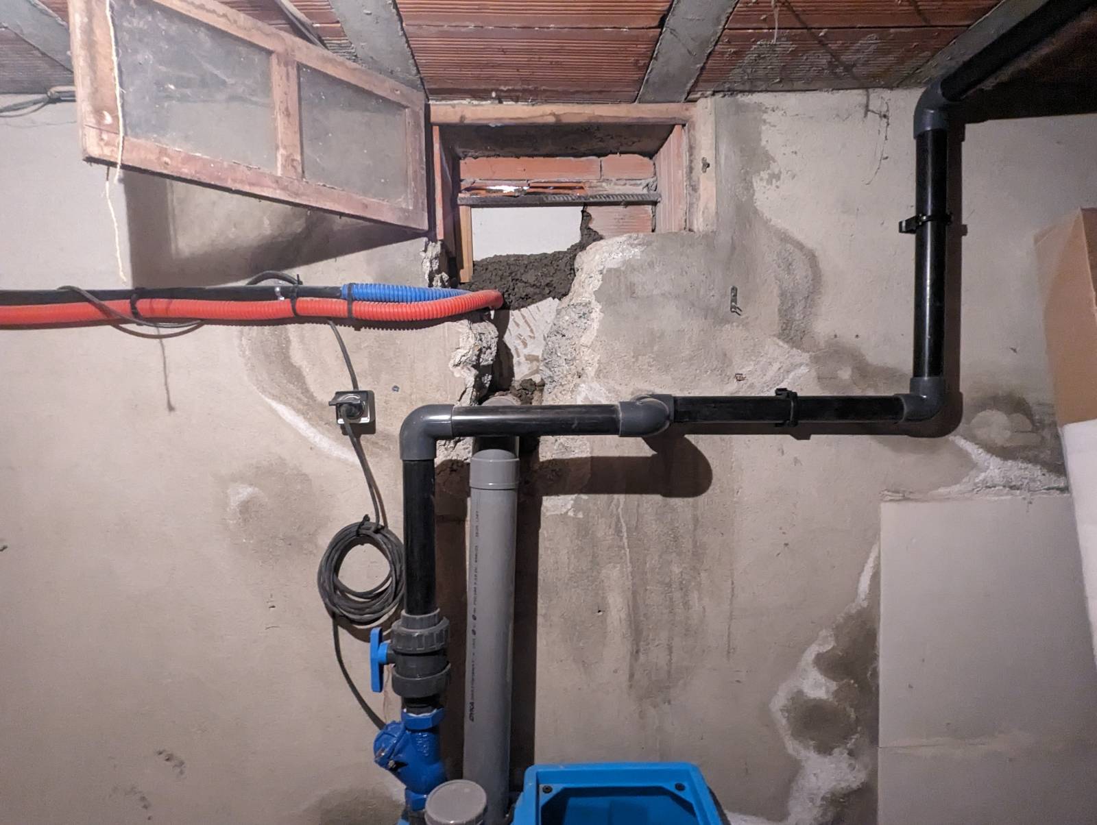 - Mise en place de pvc pression 63 fixé au plafond de la cave et raccordé au tuyau d’évacuation existant de la maison.